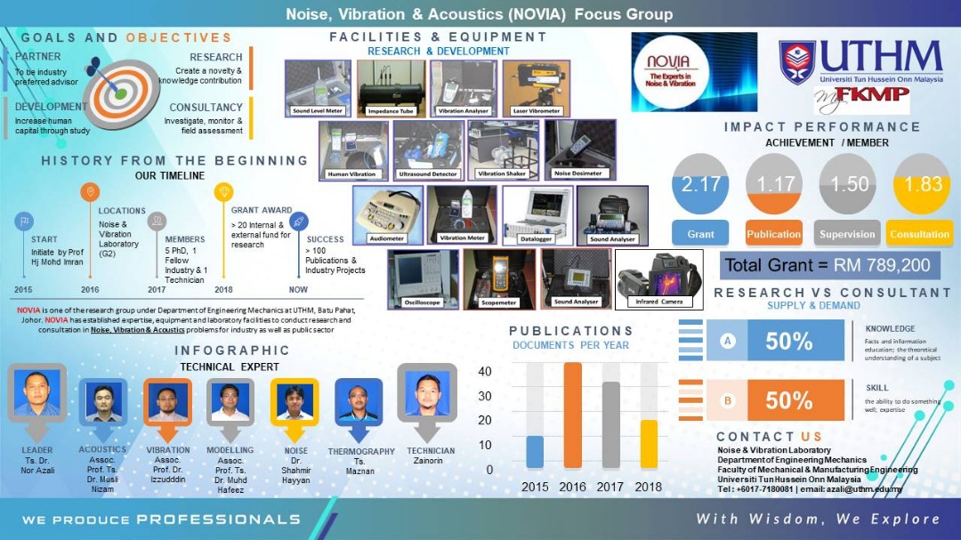 Establish in 2015, NOVIA is one of the research group under Department of Engineering Mechanics at UTHM, Batu Pahat, Johor. The NOVIA has established expertise, equipment and laboratory facilities to conduct research and consultation in noise and vibration problems for industry as well as the public sector.