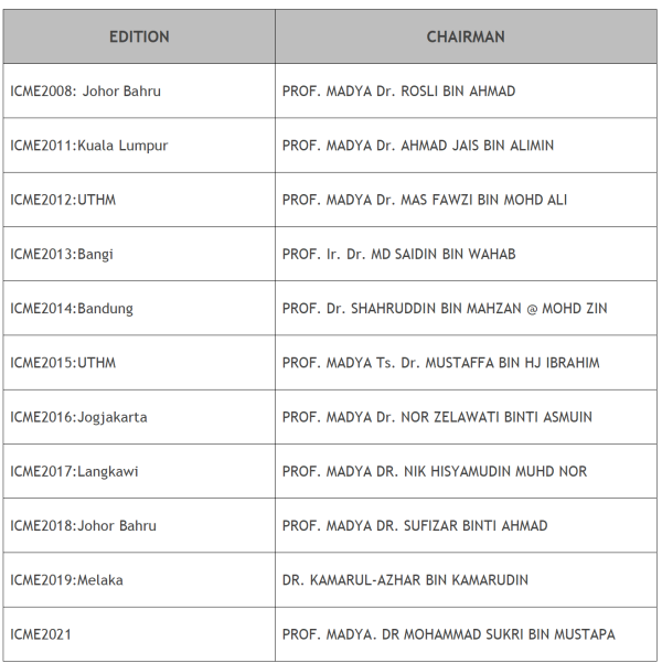 International Conference on Mechanical and Manufacturing Engineeing or ICME is organized by the Faculty of Mechanical and Manufacturing Engineering, Universiti Tun Hussein Onn Malaysia (UTHM) has been an annual conference since 2008. This conference is an interactive event for researchers and industrial players to exchange knowledge and ideas for the betterment of the future. Local and international participants are most welcome to join the conference either as participants or paper presenters.