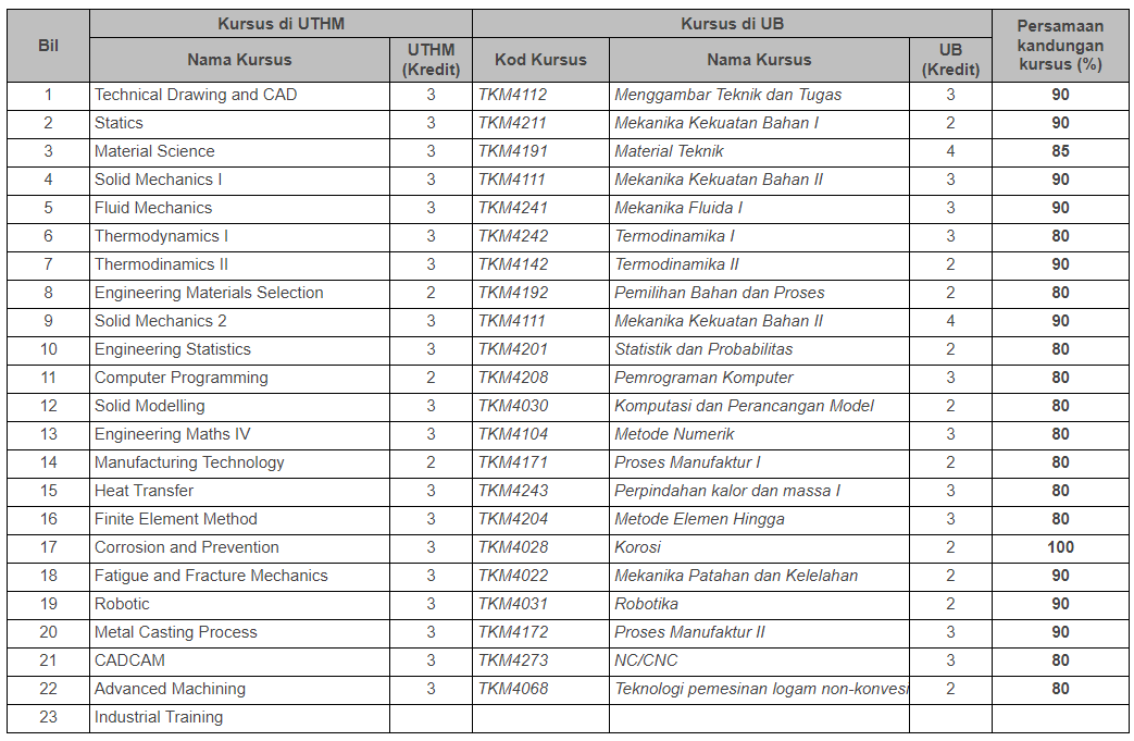 Jadual kesetaraan kursus program sarjana muda kejuruteraan di Fakulti Kejuruteraan Mekanikal dan Pembuatan, Universiti Tun Hussein Onn Malaysia dengan Jurusan Teknik Mesin, Fakultas Teknik Universitas Brawijaya