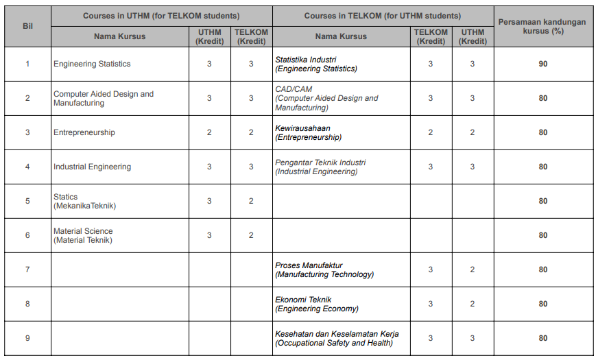 Jadual Kesetaraan kursus program sarjana muda kejuruteraan di FKMP, UTHM dengan TELKOM